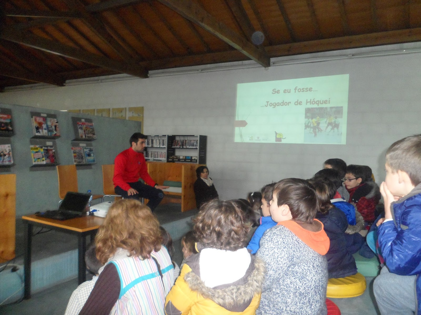Mensalmente a Biblioteca dinamiza uma rubrica mensal de cariz pedagógico alusivo às profissões, assim este mês foi a vez dos jogadores de hóquei. A atividade intitulada ” Se eu fosse…jogador de hóquei?”, contou com a presença especial do capitão do RAHC , que esta manhã, explicou como se pratica este desporto, como funciona esta coletividade e ainda elucidou algumas das dúvidas que as crianças tinham. Participaram os meninos mais velhos do JI Avenida e a turma do 1º ano, que receberam um certificado de participação, para mais tarde recordar.